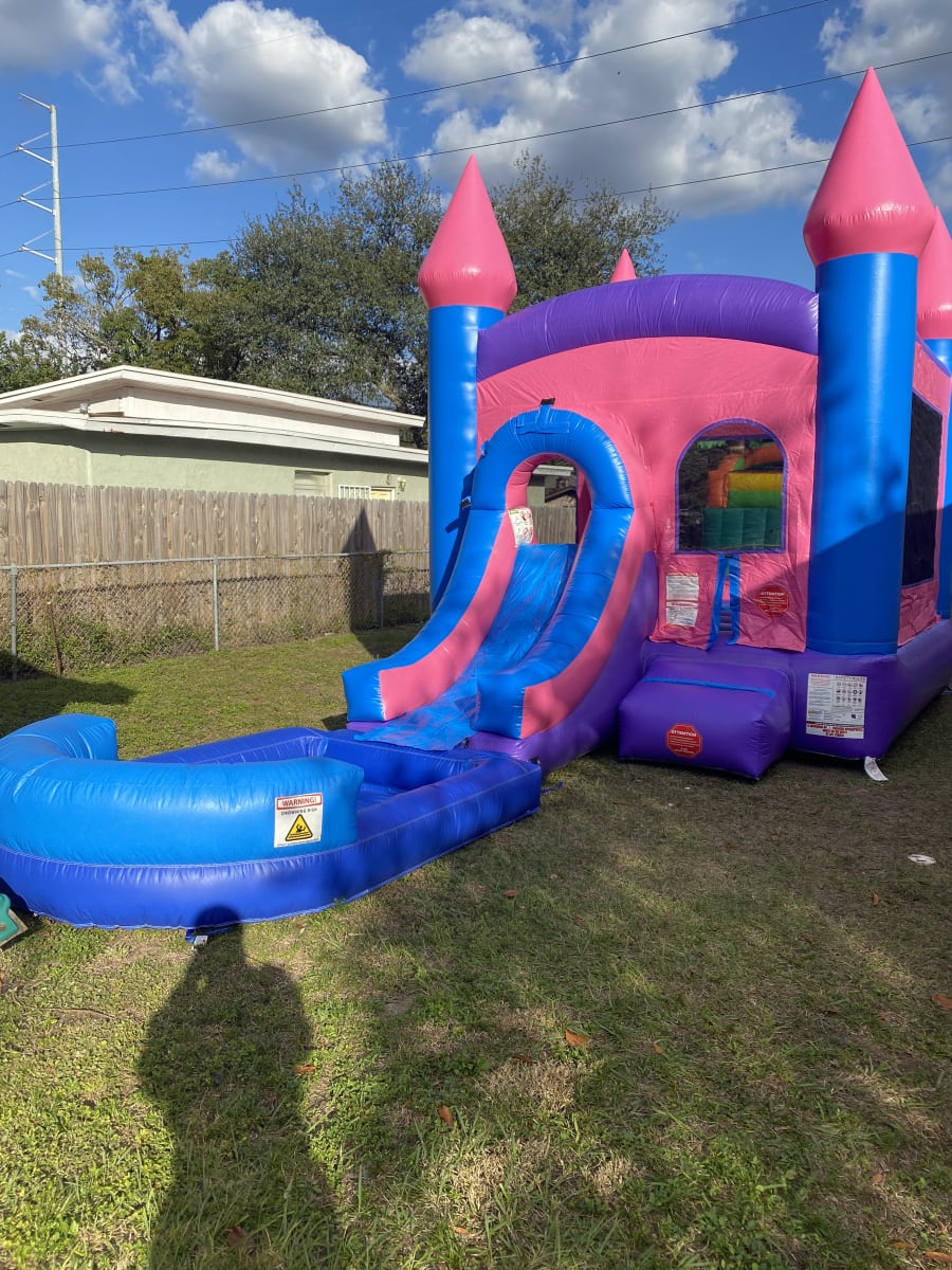 This is our pink and purple-colored combo bounce house unit. It can be used wet or dry for your year round needs!
