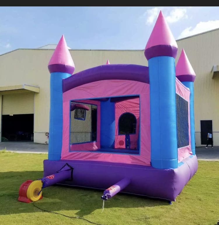 This is our pink and purple-colored combo bounce house unit. It can be used wet or dry for your year round needs!